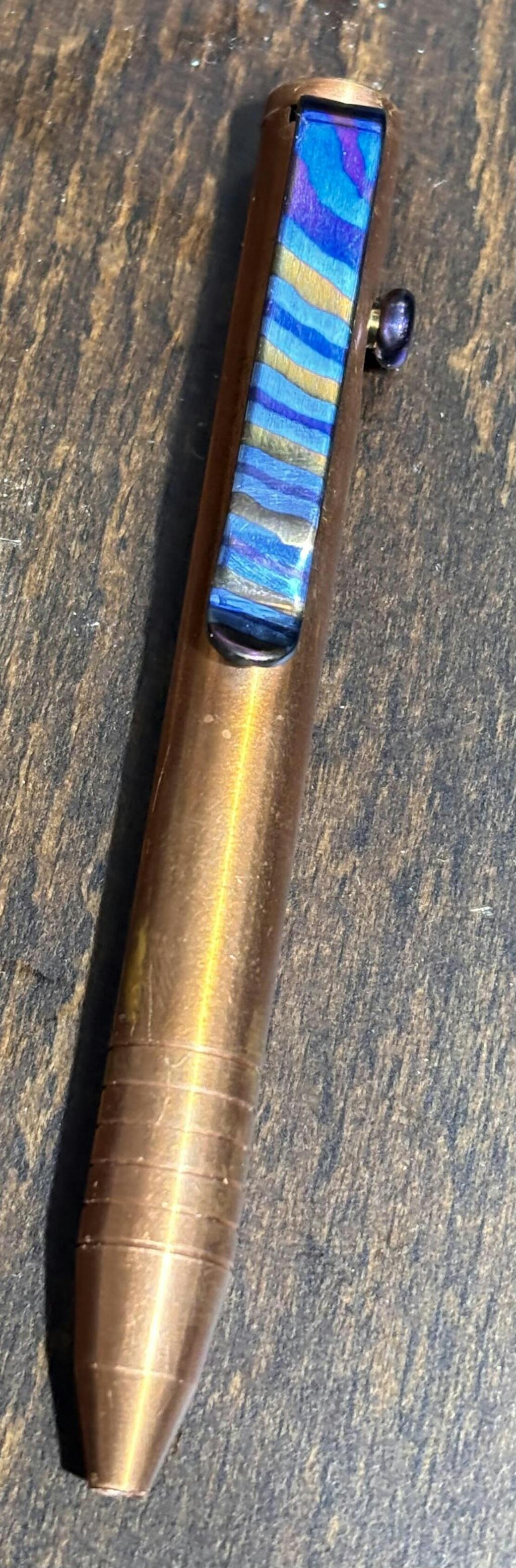 Very cool addition to the slim bolt action pen. The finish is a little darker (I understand that there are variations given the material) than I anticipated (I am just comparing the underside of the clip to the outside). I would have preferred a little brighter pop of color, but if you are considering purchasing and worrying about it being too bright, just buy it! It will not be too bright/distracting (there is a finish on it that tones it down).