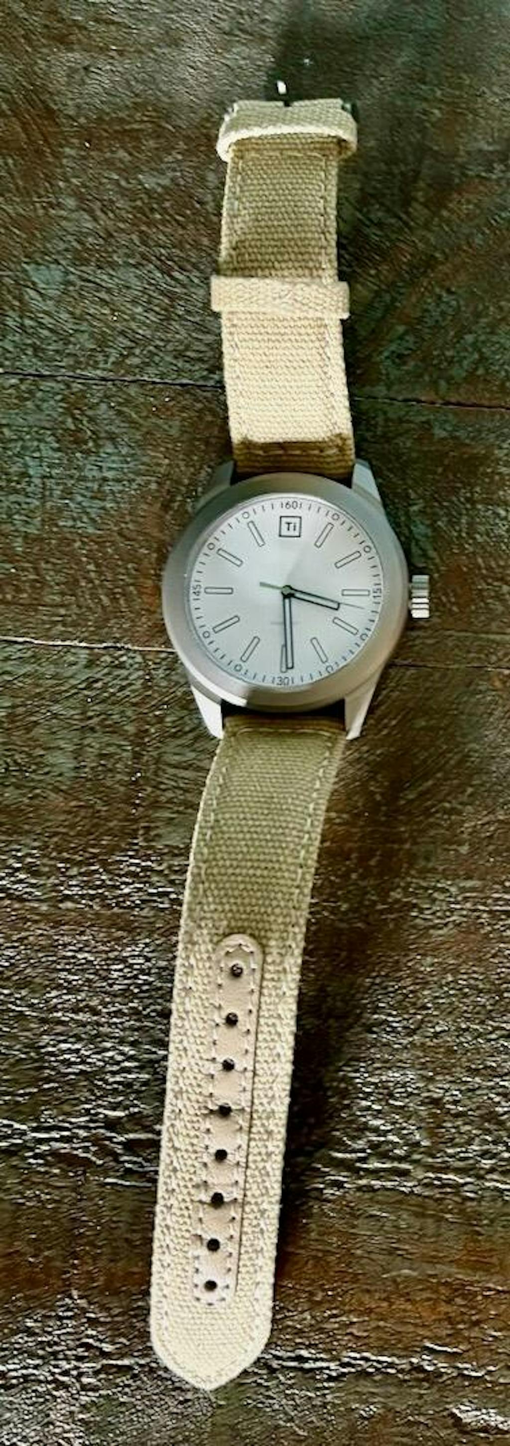 •40mm Case •48mm Lug to Lug •11.2mm Case Thickness •43.2 Grams (watch head only) •Seiko/TMI VH31 Mecha-Quartz Movement (371 Battery) •2 Year Battery Life •100m Water Resistant •Flat Sapphire Crystal •Swiss Superluminova BGW9 •Easy Access Battery Door "Hatch" , No Specialty Tools Required •Free Spinning Push Pull Crown •20mm band width / 121mm point side / 98mm buckle side •Two Piece Canvas Strap W/ Leather Backing and Titanium Buckle •2 Year Warranty