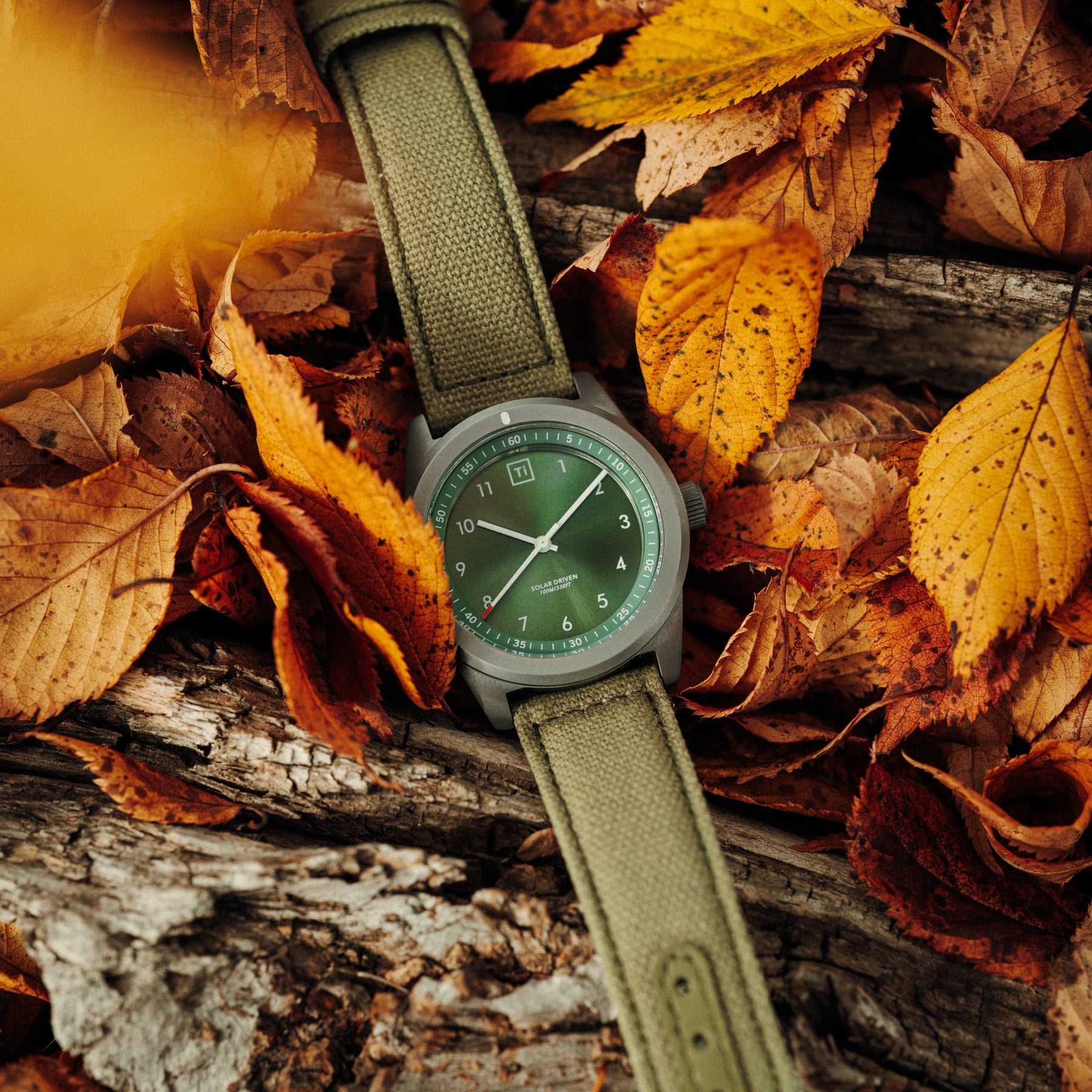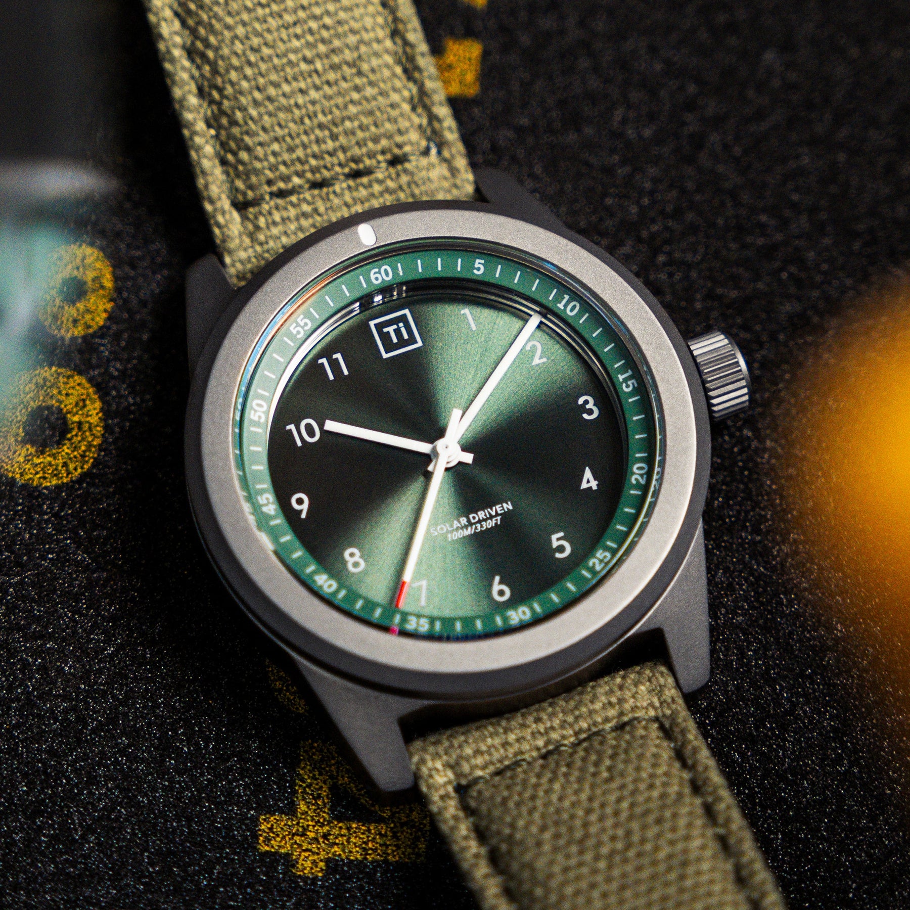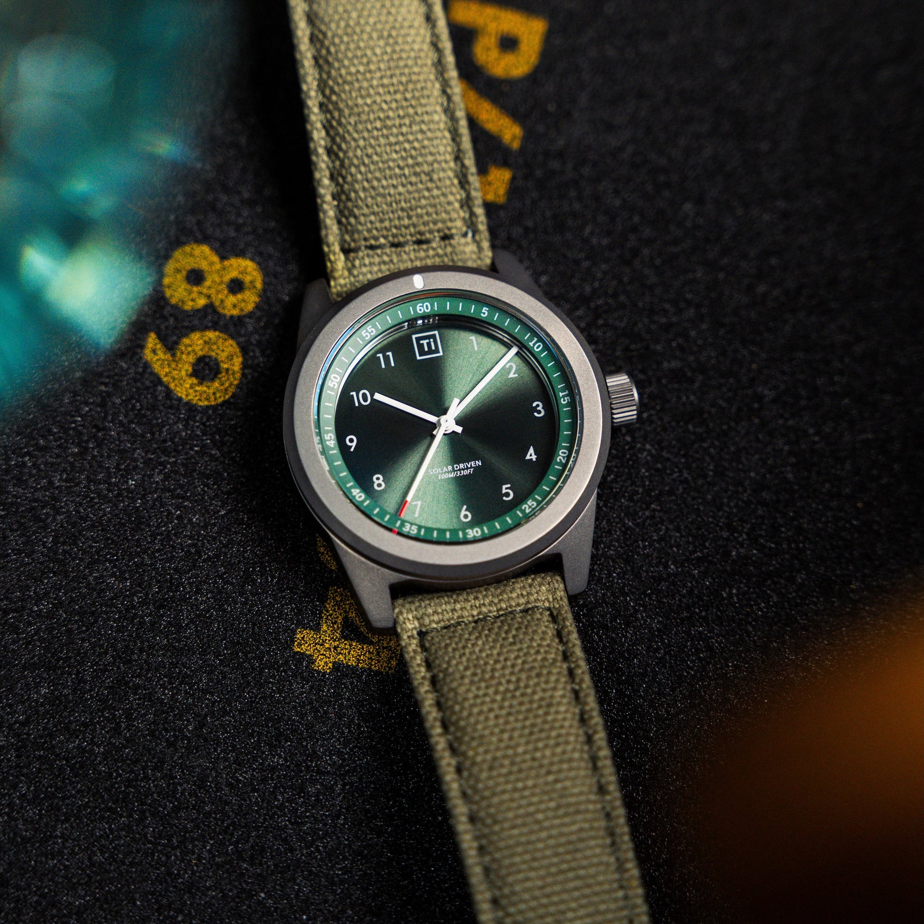 The Ti Daily Solar is BACK for 2025! This year we went with our favorite color, other than titanium of course, Green! A subtle triple tone green setup, two tone on the face, and a slightly lighter green canvas strap. Textured dial with a smooth chapter ring gives you not only a color variance but a slight textural difference to really emphasize the dimension that this model was built around. Solid Titanium case around a Miyoto 2070 solar movement, which allows us to have a solid dial design and still allows for light to reach the solar panel unobstructed. This is a limited run of 300 pieces, each numbered on the case back!